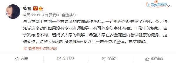 “非常非常抱歉,由于我考虑不周,造成了大家的误解,希望大家在安全范围内尝试健康的健身、拉伸动作,希望大家都能身体健康,我以后一定会更加谨慎,再次抱歉。 ”