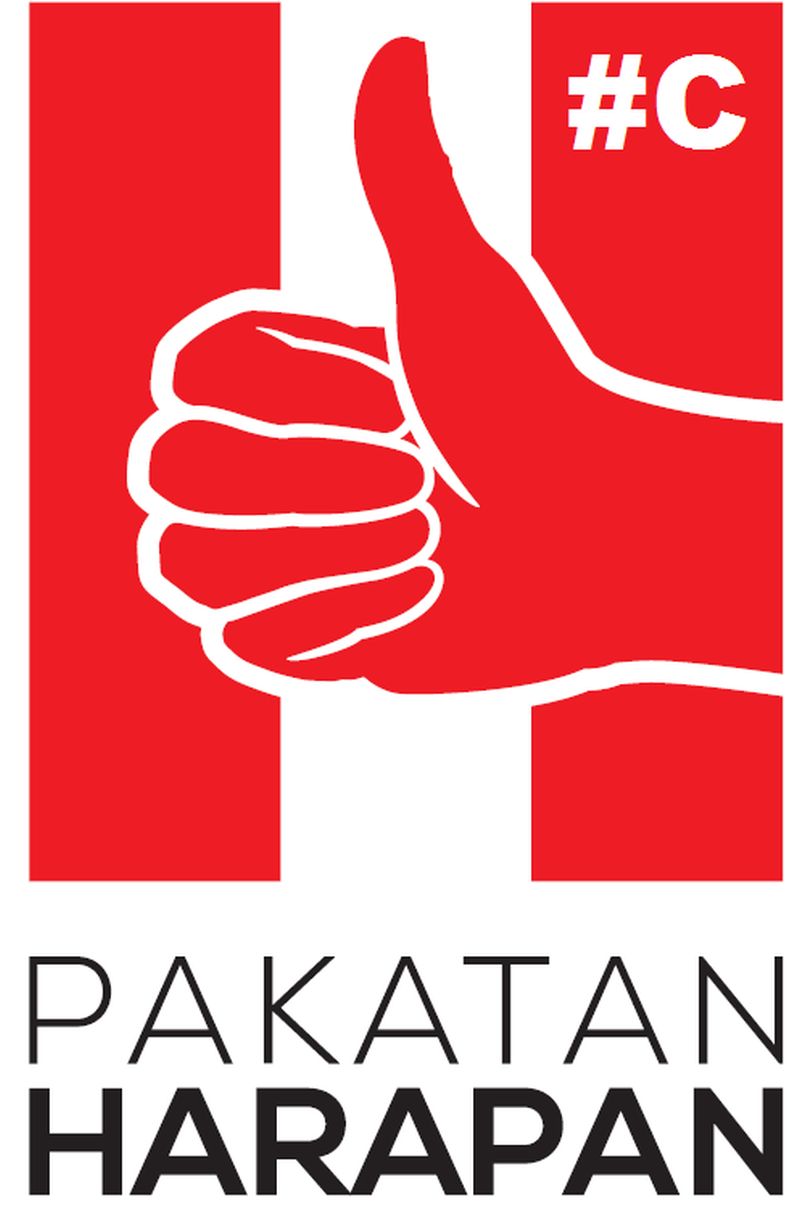第三个标志以红白色为主,可见一个竖起的红色大拇指,拇指下有黑色的“Pakatan Harapan”字眼。