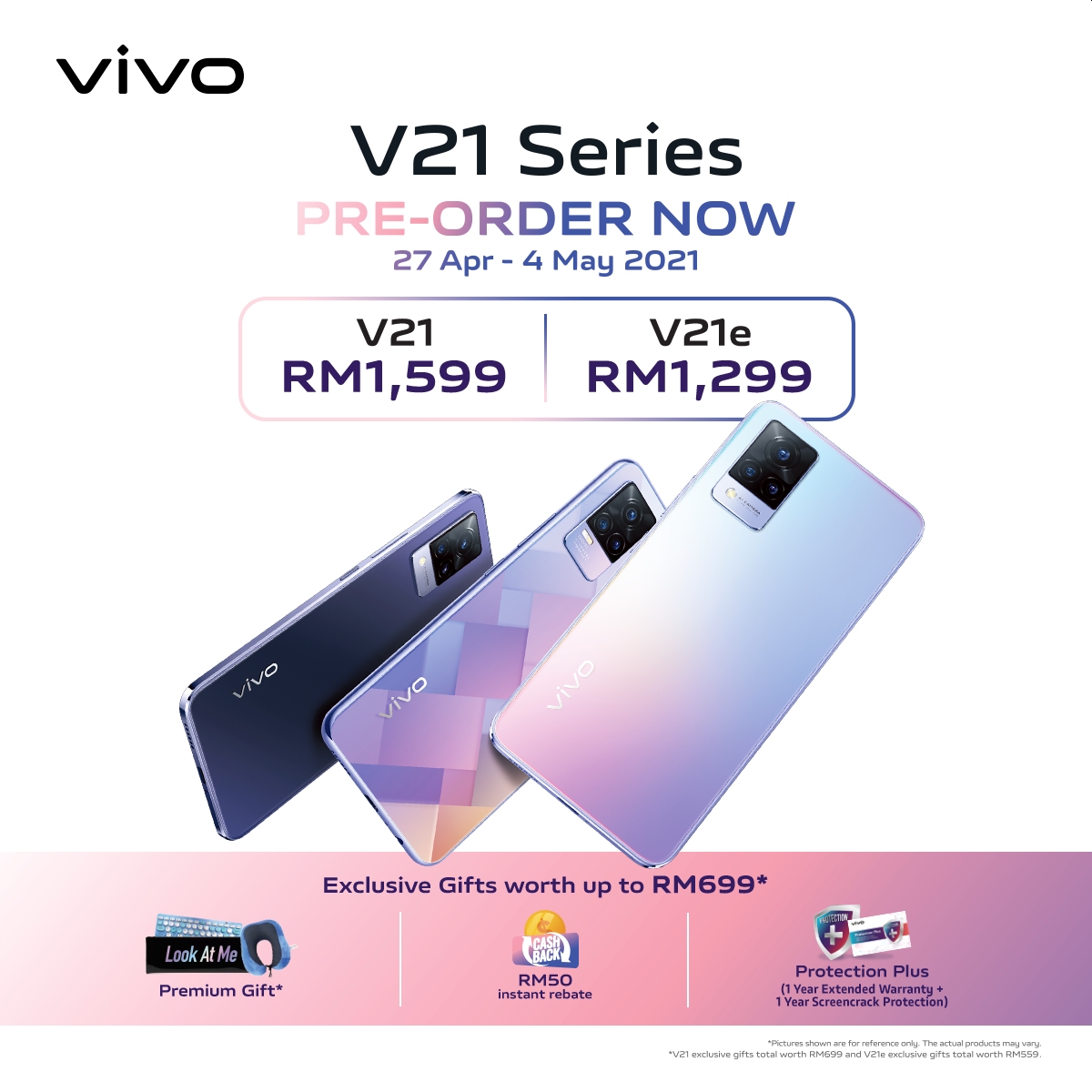 Vivo V21系列的预购活动将从即日起至下周二(4日)进行,预购的民众还有机会获赠价值699令吉的礼品,包括50令吉的即时回扣、额外的保护服务(1年延长保修服务+ 1年屏幕防裂保护)和高价礼品,送完为止。